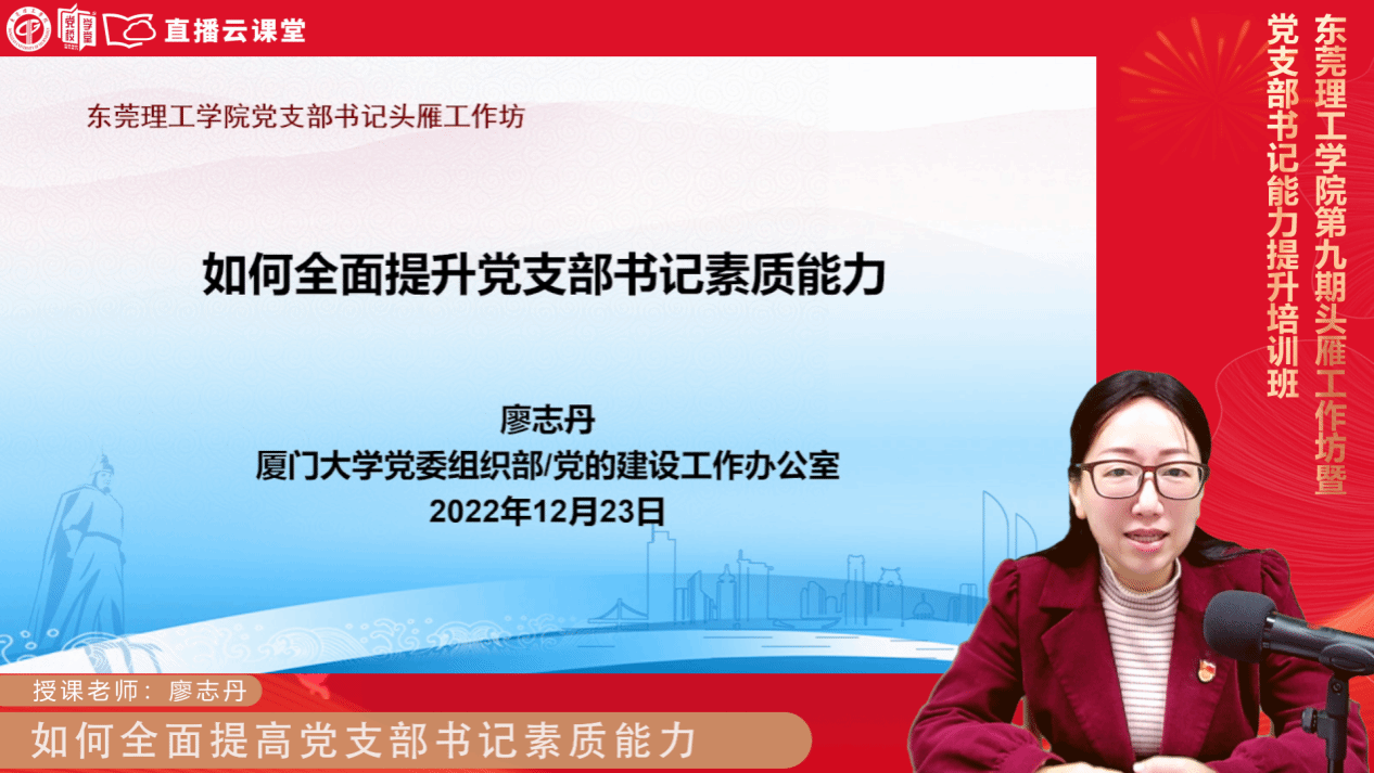 厦门大学党委党建办主任兼组织部副部长、教师工作部副部长廖志丹副教授作《如何全面提升党支部书记素质能力》主题报告,受到了学员们的欢迎。廖志丹围绕“提升政治素养,做政治上的明白人”“提升理论素养,做专家型的先行者”“提升党务素养,做精细化的内行人”“提升综合素养,做立体化的多面手”等四方面与大家分享了夯实党支部建设、全面提升党支部书记素质能力的许多妙方,导学了党的二十大修订的《中国共产党章程》。