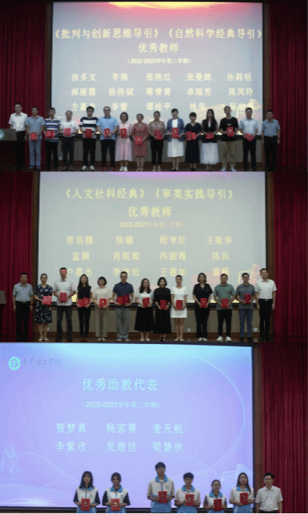 为感谢基础导引课程专任教师与学生助教在2022-2023学年第二学期基础导引课程中作出的卓越贡献,会议设置了优秀教师与优秀助教的颁奖环节。现场,徐多文、张艳红等27位优秀教师登上舞台,马宏伟、徐勇军为他们颁发证书及莞工校历。贺梦真、杨家菁等6位助教作为上学期28位优秀助教代表登上舞台,兰善红为他们颁发证书。