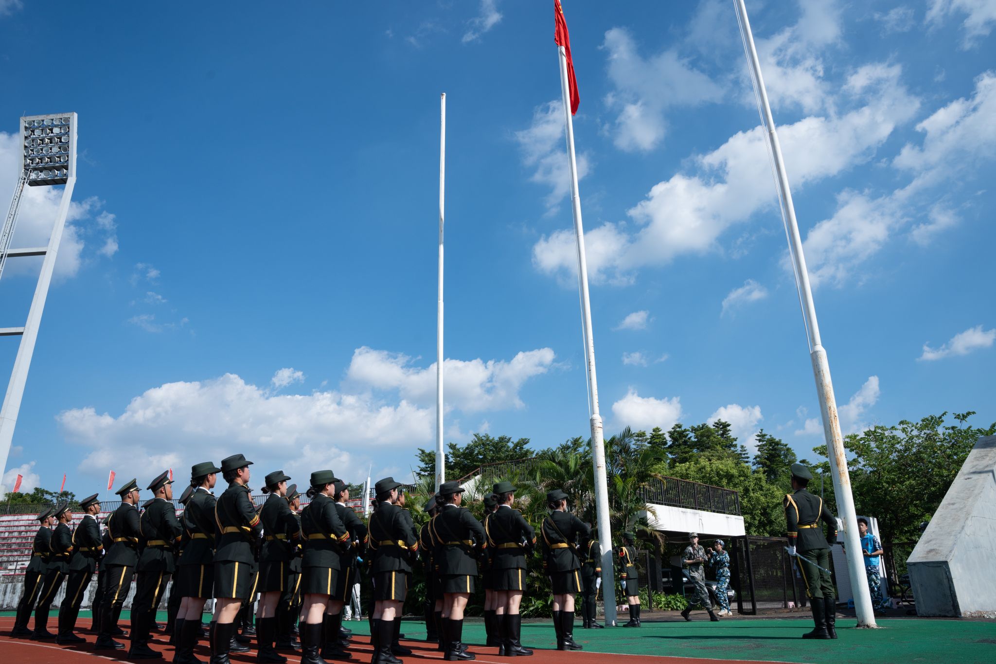 国旗护卫队步伐铿锵,行进至升旗台,全体参会人员高声唱响国歌,注视五星红旗冉冉升起。庄严的国歌声中,军训总结表彰大会拉开了序幕。