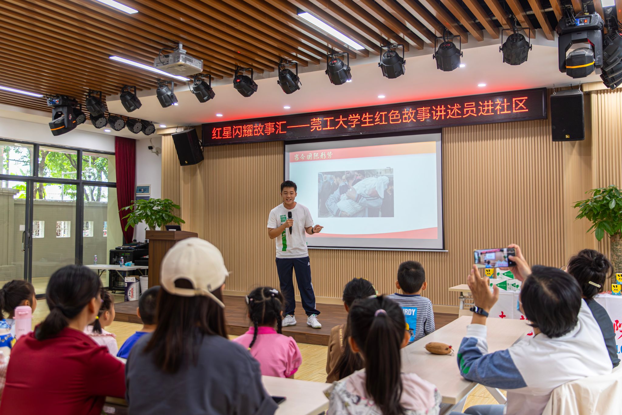 11月9日,“红星闪耀故事汇 ——莞工大学生红色经典故事讲述员进社区”活动在松山湖社区综合服务中心举行。此次活动面向周边社区的亲子家庭展开,旨在办好红色教育、讲好红色故事、传承红色基因,让红色文化不仅在校园中传播,也在社会上闪耀。来自莞工的两名优秀红色经典故事讲述员罗凯伦和杨碗义依次登台讲述革命先烈的英雄事迹,在孩子们心中播撒“红色种子”,为家长们树立红色模范。