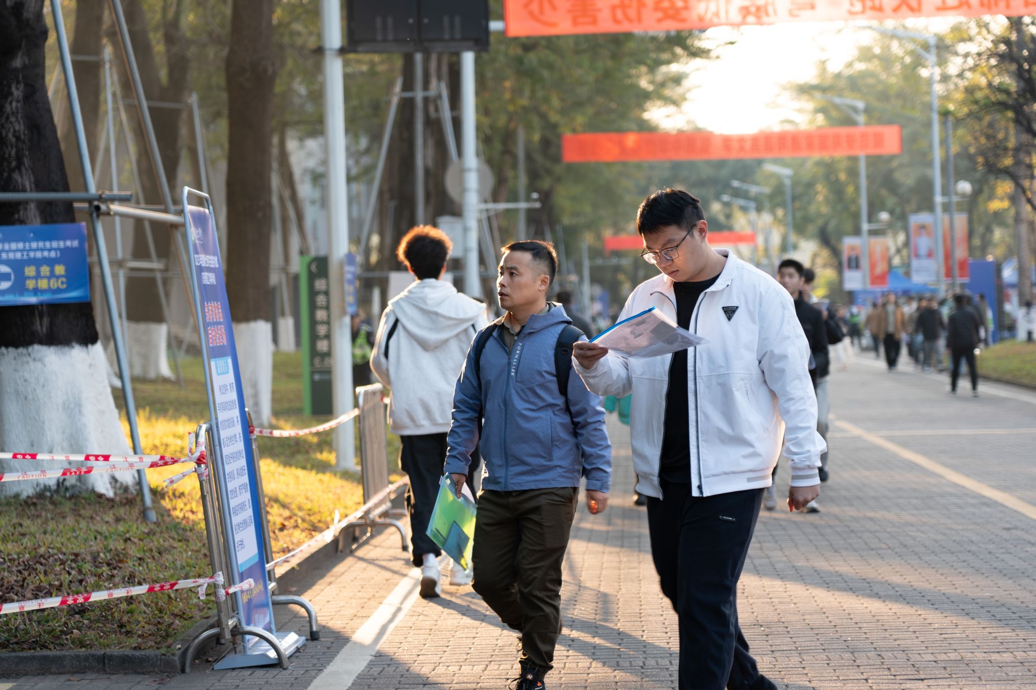 12月21日早上7:30-7:50,松山湖校区北门和南门迎来了进校人流高峰期。恰逢冬至,早晚温度较低,考生们“全副武装”,裹得严严实实,背着装满复习资料和文具的厚重书包赶考,眼神坚定而炽热。