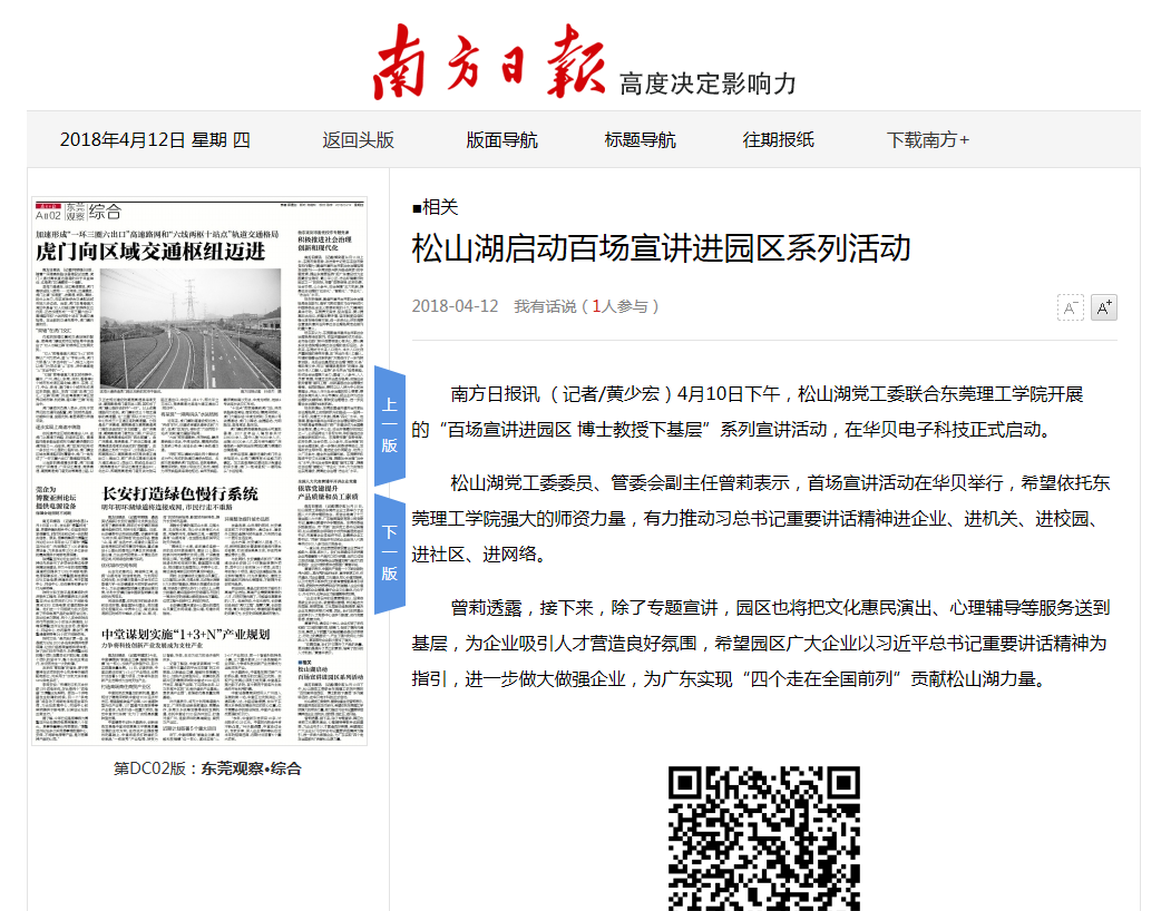 4月10日下午,松山湖党工委联合开云kaiyun官方网站开展的“百场宣讲进园区 博士教授下基层”系列宣讲活动,在华贝电子科技正式启动。
