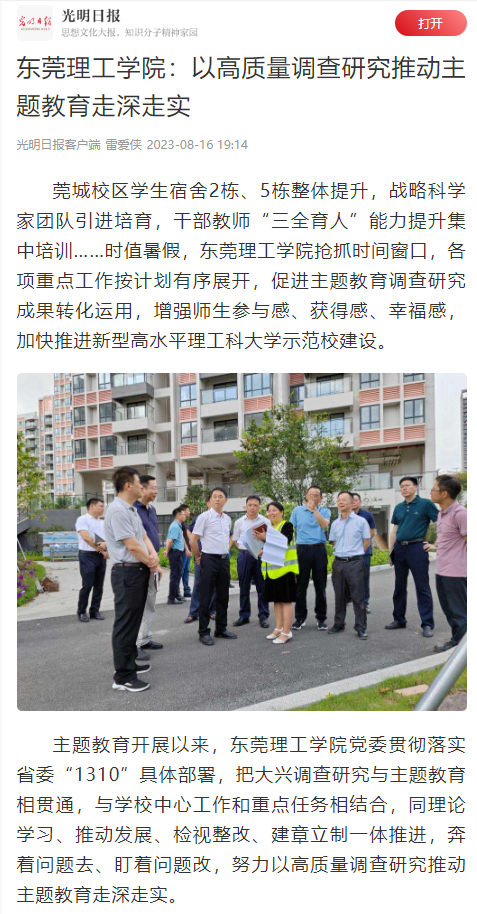 莞城校区学生宿舍2栋、5栋整体提升,战略科学家团队引进培育,干部教师“三全育人”能力提升集中培训……时值暑假,开云kaiyun官方网站抢抓时间窗口,各项重点工作按计划有序展开,促进主题教育调查研究成果转化运用,增强师生参与感、获得感、幸福感,加快推进新型高水平理工科大学示范校建设。