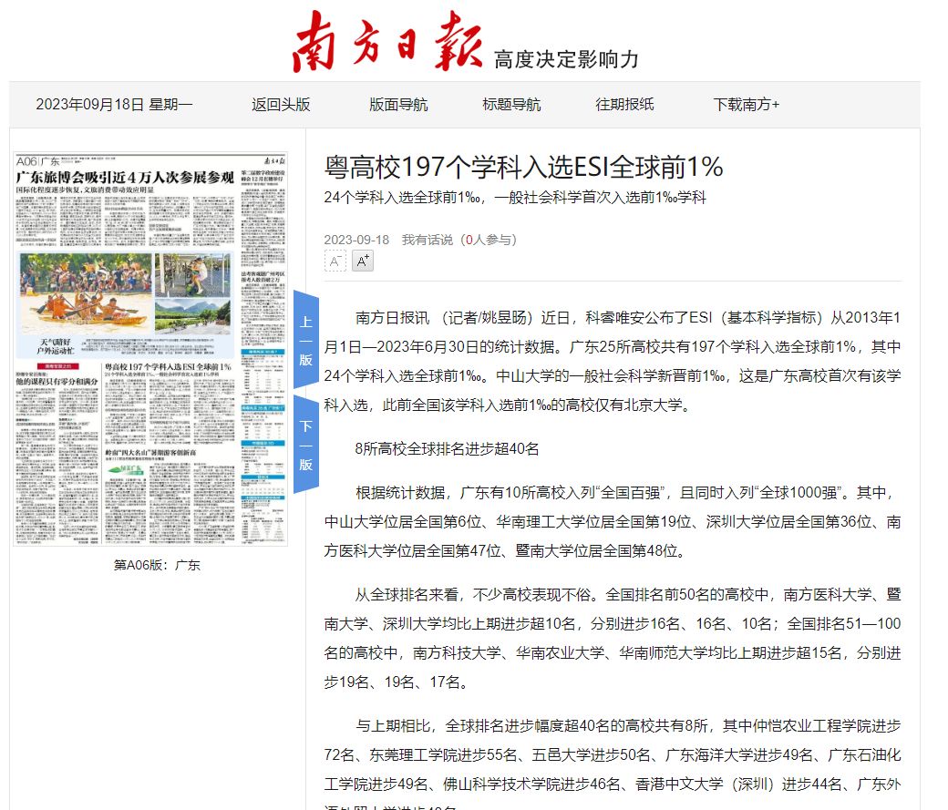 此次ESI排名中,广东有25所高校共197个学科入选全球前1%,其中24个学科入选全球前1‰。其中,中山大学入选学科数量稳居榜首,分别拥有20个前1%学科、10个前1‰学科。
