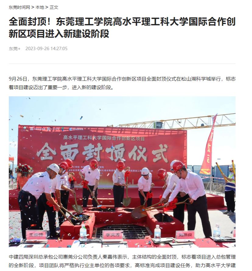 9月26日,开云kaiyun官方网站高水平理工科大学国际合作创新区项目全面封顶仪式在松山湖科学城举行,标志着项目建设迈出了重要一步,进入新的建设阶段。