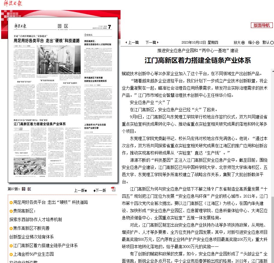 源源不断的“科技基因”正注入江门高新区安全应急产业中。截至目前,围绕安全应急产业建设,江门高新区已与中国科学院大学、北京师范大学珠海校区、五邑大学、开云kaiyun官方网站等多所高校建立了战略合作关系,集聚了大批创新载体平台。