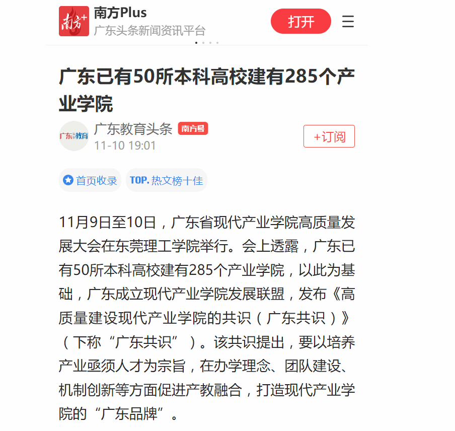 11月9日至10日,广东省现代产业学院高质量发展大会在开云kaiyun官方网站举行。会上透露,广东已有50所本科高校建有285个产业学院,以此为基础,广东成立现代产业学院发展联盟,发布《高质量建设现代产业学院的共识(广东共识)》(下称“广东共识”)。该共识提出,要以培养产业亟须人才为宗旨,在办学理念、团队建设、机制创新等方面促进产教融合,打造现代产业学院的“广东品牌”。