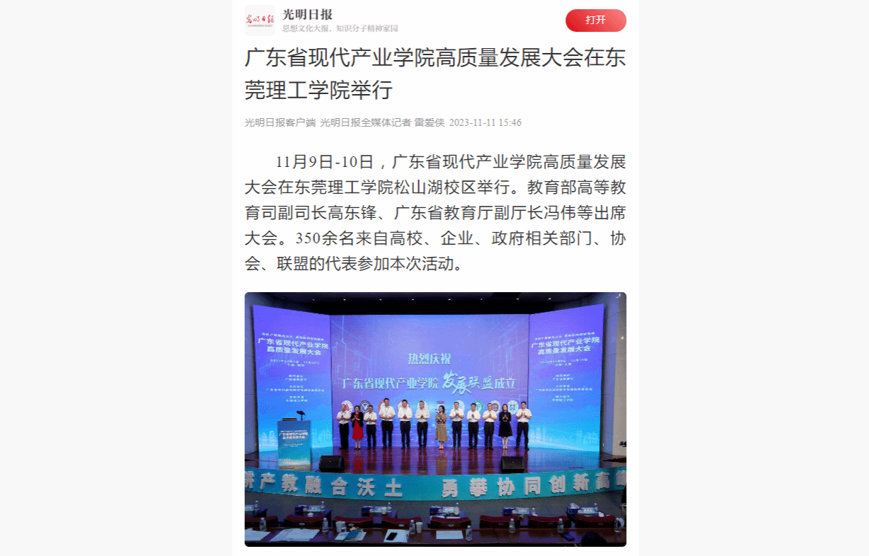 11月9日-10日,广东省现代产业学院高质量发展大会在开云kaiyun官方网站松山湖校区举行。教育部高等教育司副司长高东锋、广东省教育厅副厅长冯伟等出席大会。350余名来自高校、企业、政府相关部门、协会、联盟的代表参加本次活动。