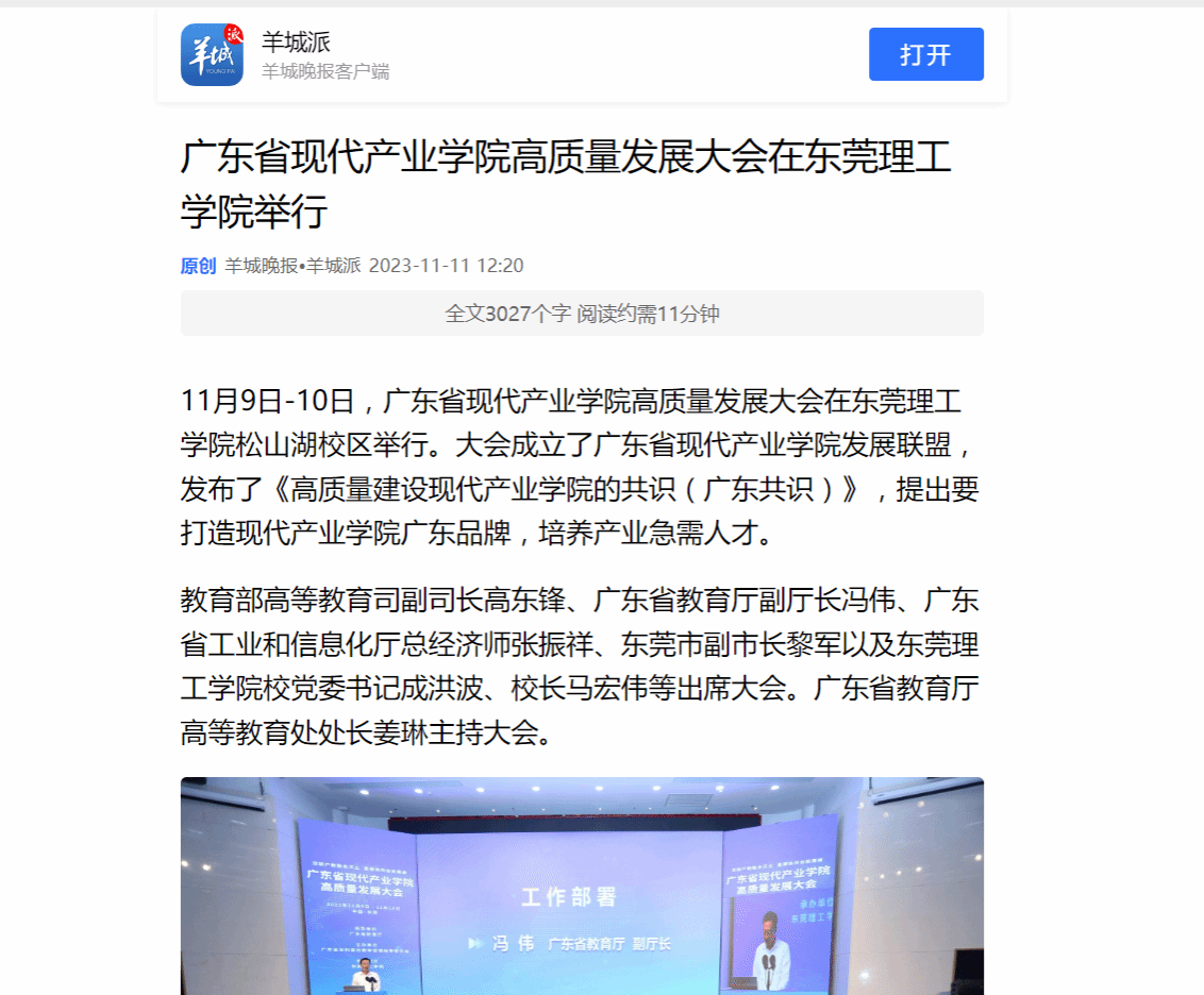 11月9日-10日,广东省现代产业学院高质量发展大会在开云kaiyun官方网站松山湖校区举行。大会成立了广东省现代产业学院发展联盟,发布了《高质量建设现代产业学院的共识(广东共识)》,提出要打造现代产业学院广东品牌,培养产业急需人才。