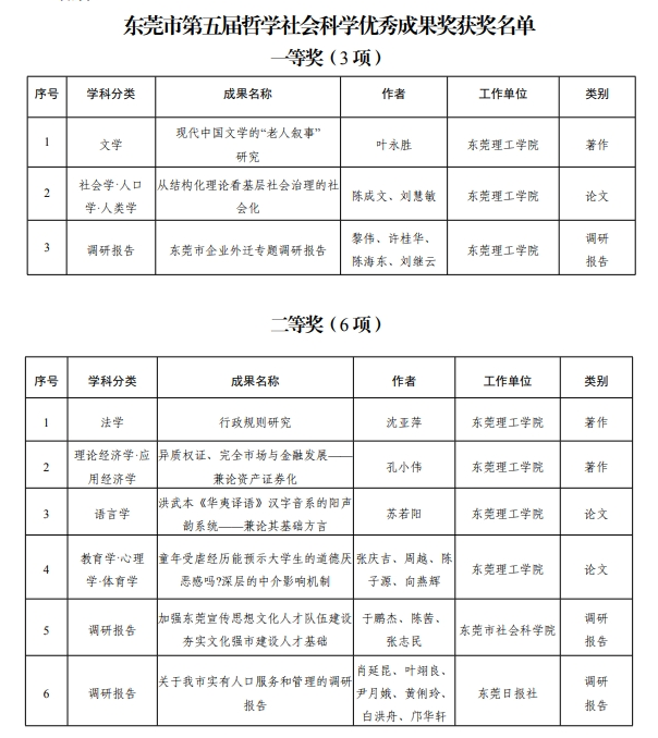 东莞市第五届哲学社会科学优秀成果奖获奖名单