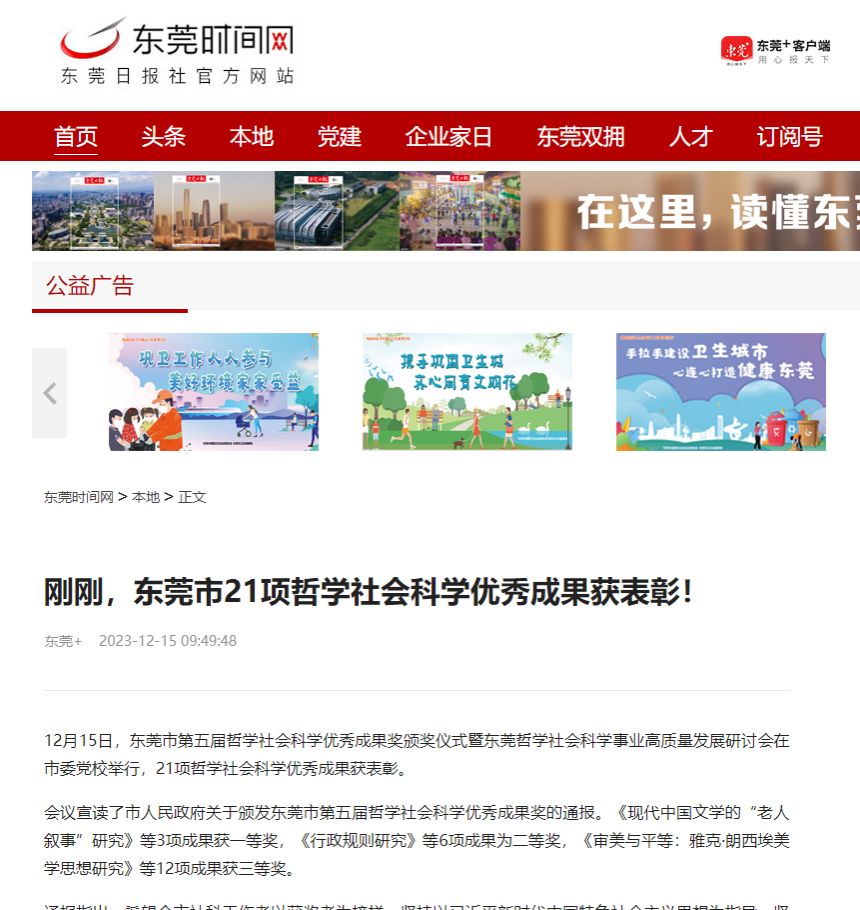 12月15日,东莞市第五届哲学社会科学优秀成果奖颁奖仪式暨东莞哲学社会科学事业高质量发展研讨会在市委党校举行,21项哲学社会科学优秀成果获表彰。