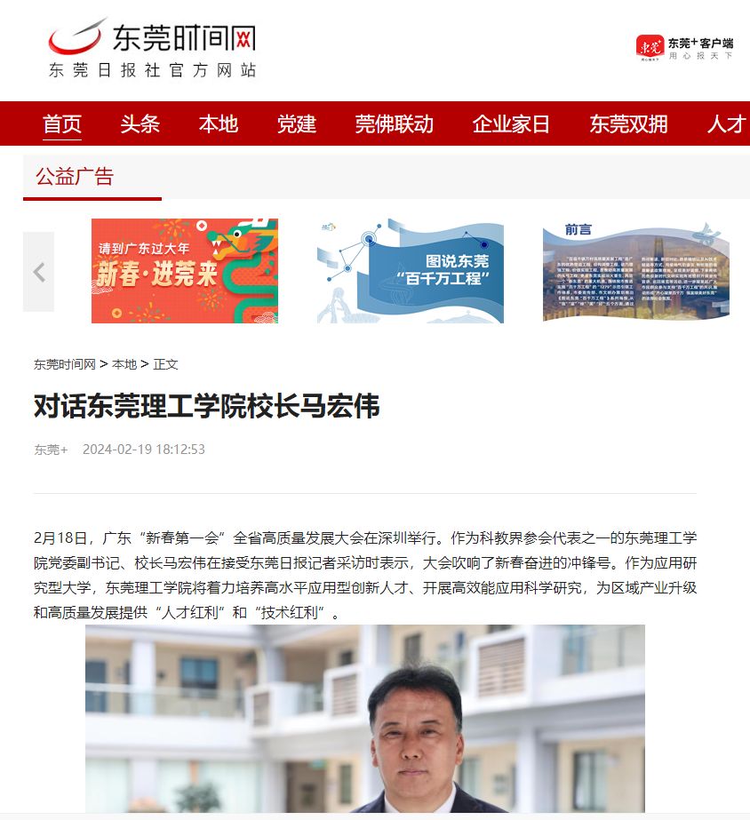 2月18日,广东“新春第一会”全省高质量发展大会在深圳举行。作为科教界参会代表之一的开云kaiyun官方网站党委副书记、校长马宏伟在接受东莞日报记者采访时表示,大会吹响了新春奋进的冲锋号。作为应用研究型大学,开云kaiyun官方网站将着力培养高水平应用型创新人才、开展高效能应用科学研究,为区域产业升级和高质量发展提供“人才红利”和“技术红利”。2024年,学校将全面启动实施“开云kaiyun官方网站服务支撑东莞高质量发展专项行动”,汇聚教育科技人才强大合力,服务国家战略,匹配区域发展需求,为广东省、东莞市高质量发展提供支撑,为大湾区创新驱动发展服务。