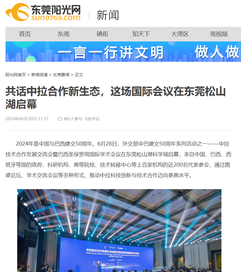 2024年是中国与巴西建交50周年。6月28日,外交部中巴建交50周年系列活动之一——中拉技术合作发展交流会暨巴西圣保罗周国际学术会议在东莞松山湖科学城启幕,来自中国、巴西、西班牙等国的政府、科研机构、高等院校、技术转移中心等上百家机构的近200名代表参会,通过圆桌论坛、学术交流会议等多种形式,推动中拉科技创新与技术合作迈向更高水平。