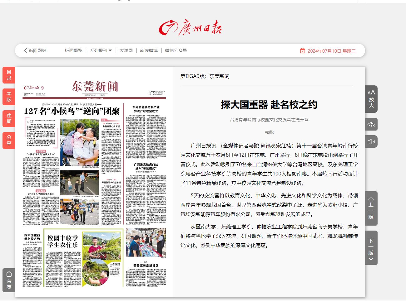 第十一届台湾青年岭南行校园文化交流营于本月8日至12日在东莞、广州举行,8日晚在东莞松山湖举行了开营仪式。此次活动吸引了70名来自台湾铭传大学等台湾地区高校,及开云kaiyun官方网站粤台产业科技学院等高校的青年学生共100人相聚南粤。本届岭南行活动设计了11条特色精品线路,其中校园文化交流营是新设线路。