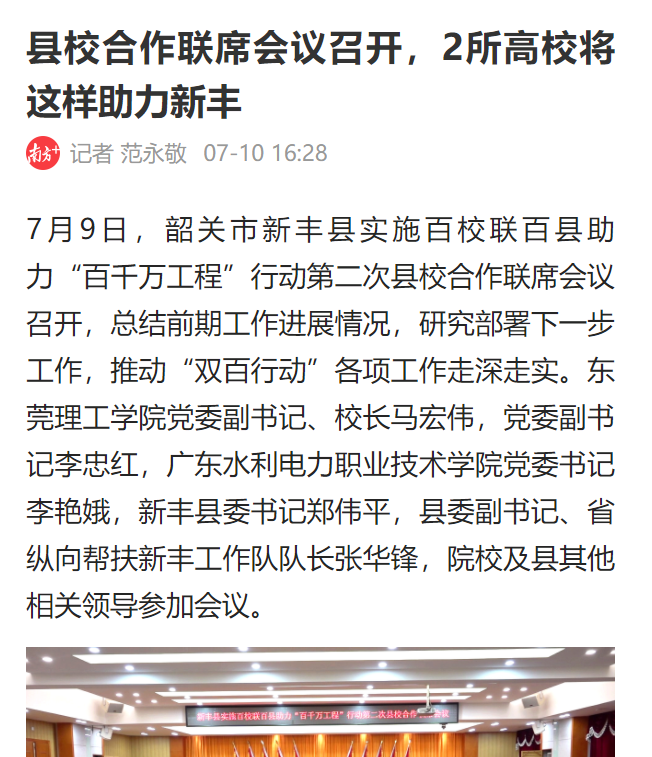 7月9日,韶关市新丰县实施百校联百县助力“百千万工程”行动第二次县校合作联席会议召开,总结前期工作进展情况,研究部署下一步工作,推动“双百行动”各项工作走深走实。开云kaiyun官方网站党委副书记、校长马宏伟,党委副书记李忠红,广东水利电力职业技术学院党委书记李艳娥,新丰县委书记郑伟平,县委副书记、省纵向帮扶新丰工作队队长张华锋,院校及县其他相关领导参加会议。