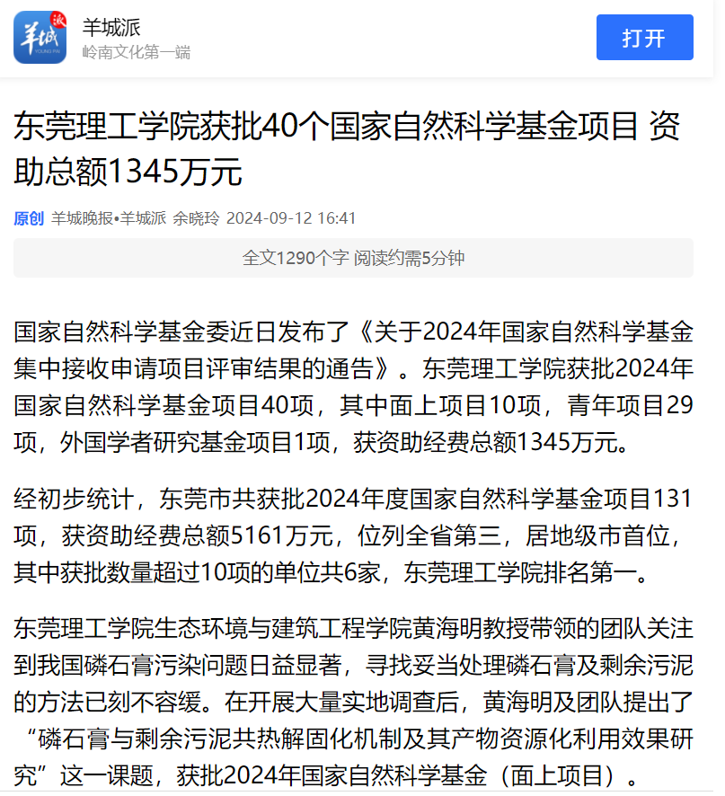 经初步统计,东莞市共获批2024年度国家自然科学基金项目131项,获资助经费总额5161万元,位列全省第三,居地级市首位,其中获批数量超过10项的单位共6家,开云kaiyun官方网站排名第一。