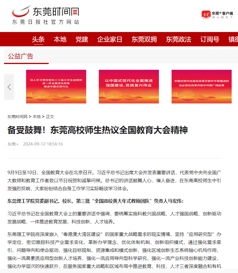 9月9日至10日,全国教育大会在北京召开。习近平总书记出席大会并发表重要讲话,代表党中央向全国广大教师和教育工作者致以节日祝贺和诚挚问候。总书记的讲话鼓舞人心、催人奋进,在东莞高校师生中引发强烈反响,大家纷纷结合自身工作学习实际畅谈学习体会。
