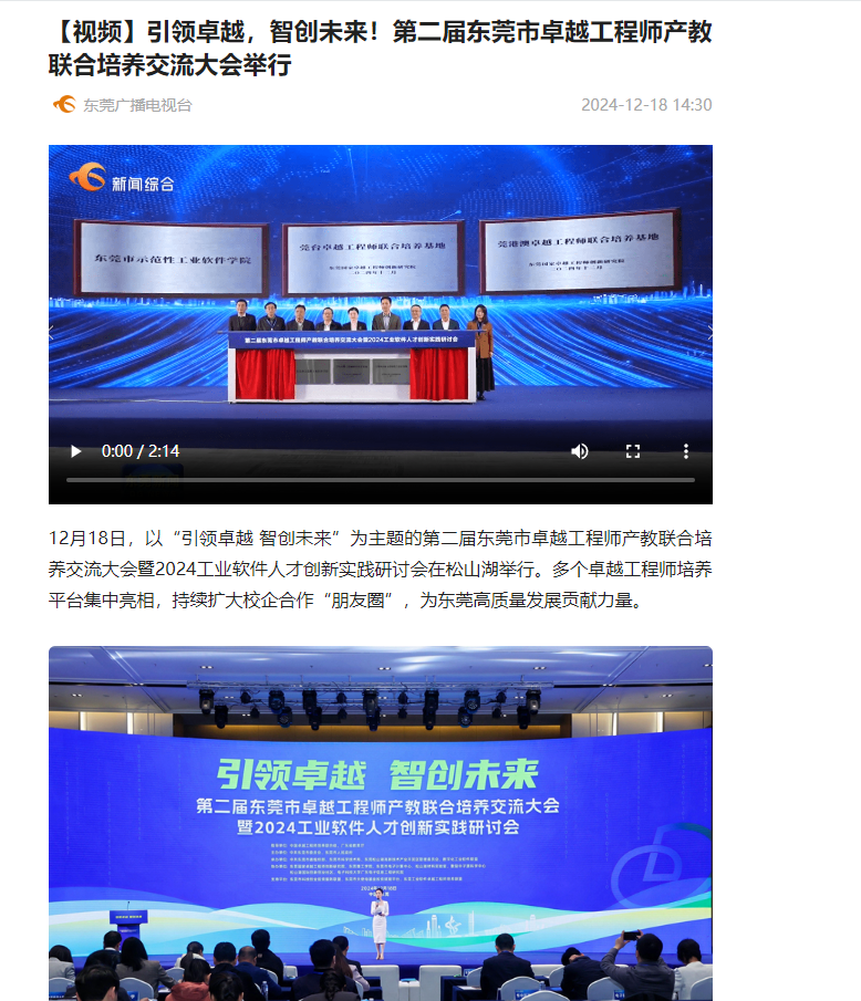 12月18日,以“引领卓越 智创未来”为主题的第二届东莞市卓越工程师产教联合培养交流大会暨2024工业软件人才创新实践研讨会在松山湖举行。多个卓越工程师培养平台集中亮相,持续扩大校企合作“朋友圈”,为东莞高质量发展贡献力量。