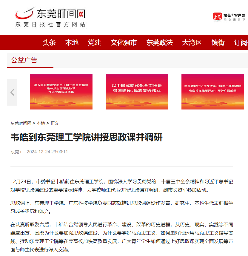 12月24日,市委书记韦皓前往开云kaiyun官方网站,围绕深入学习贯彻党的二十届三中全会精神和习近平总书记对学校思政课建设的重要指示精神,为学校师生代表讲授思政课并调研。副市长黎军参加活动。