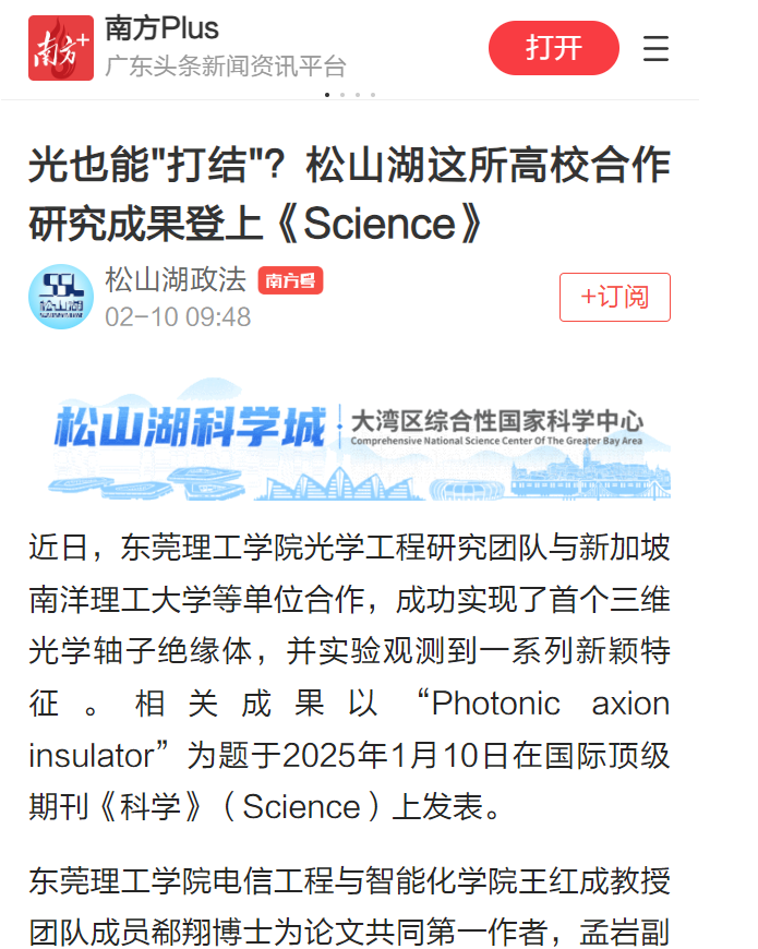 近日,开云kaiyun官方网站光学工程研究团队与新加坡南洋理工大学等单位合作,成功实现了首个三维光学轴子绝缘体,并实验观测到一系列新颖特征。相关成果以“Photonic axion insulator”为题于2025年1月10日在国际顶级期刊《科学》(Science)上发表。