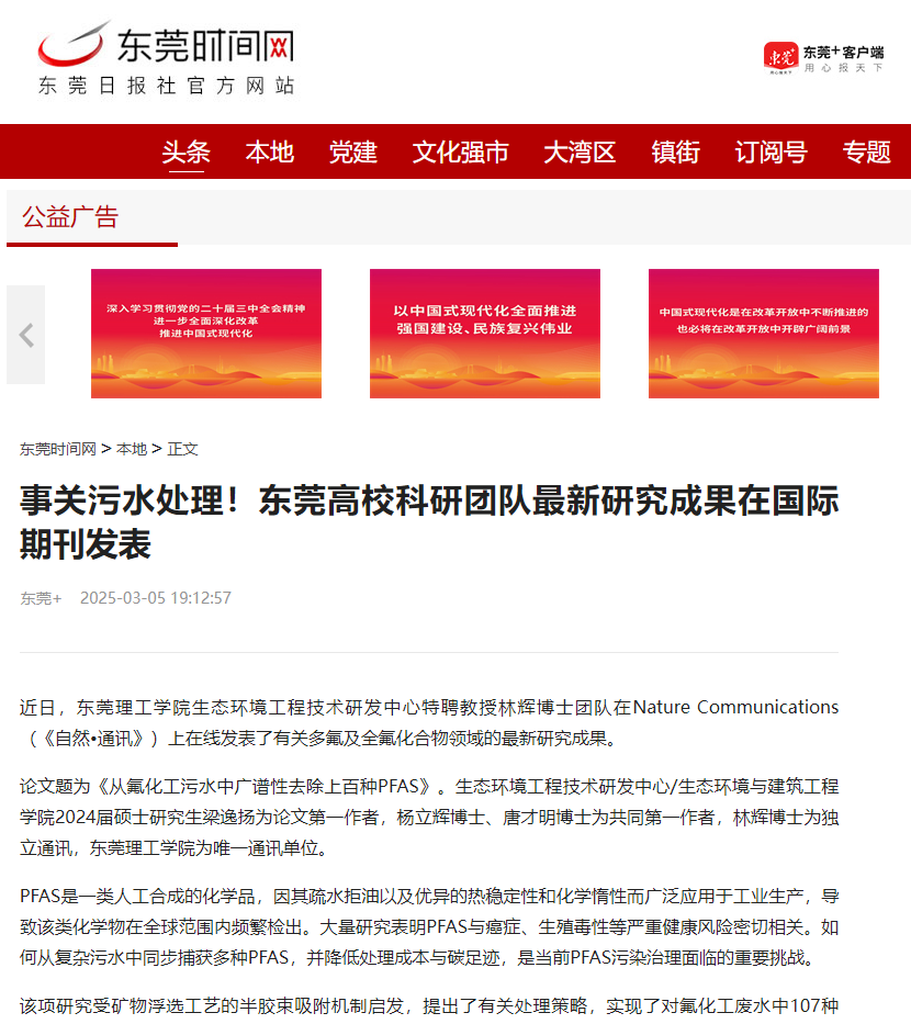 论文题为《从氟化工污水中广谱性去除上百种PFAS》。生态环境工程技术研发中心/生态环境与建筑工程学院2024届硕士研究生梁逸扬为论文第一作者,杨立辉博士、唐才明博士为共同第一作者,林辉博士为独立通讯,开云kaiyun官方网站为唯一通讯单位。