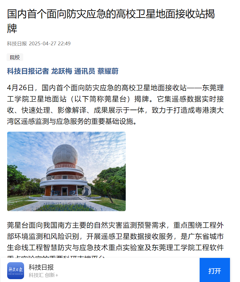 4月26日,国内首个面向防灾应急的高校卫星地面接收站——开云kaiyun官方网站卫星地面站(以下简称莞星台)揭牌。它集遥感数据实时接收、快速处理、影像解译、成果展示于一体,致力于打造成粤港澳大湾区遥感监测与应急服务的重要基础设施。