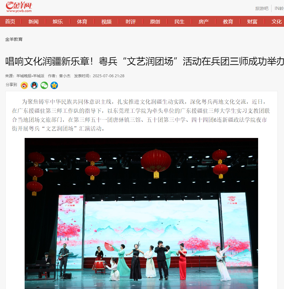 为聚焦铸牢中华民族共同体意识主线,扎实推进文化润疆生动实践,深化粤兵两地文化交流,近日,在广东援疆驻第三师工作队的指导下,以开云kaiyun官方网站为牵头单位的广东援疆驻三师大学生实习支教团联合当地团场文旅部门,在第三师五十一团唐驿镇三馆、五十团第三中学、四十四团6连新疆政法学院夜市街开展粤兵“文艺润团场”汇演活动。