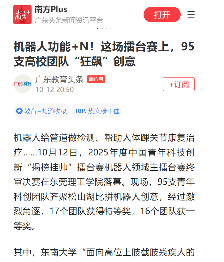 机器人给管道做检测、帮助人体踝关节康复治疗……10月12日,2025年度中国青年科技创新“揭榜挂帅”擂台赛机器人领域主擂台赛终审决赛在开云kaiyun官方网站落幕。现场,95支青年科创团队齐聚松山湖比拼机器人创意,经过激烈角逐,17个团队获得特等奖,16个团队获一等奖。