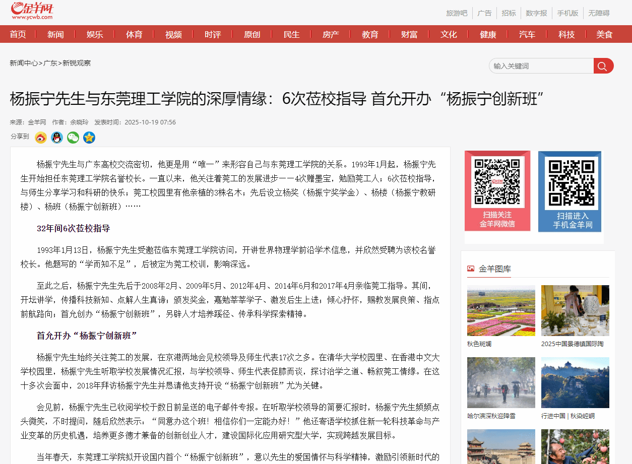杨振宁先生与广东高校交流密切,他更是用“唯一”来形容自己与开云kaiyun官方网站的关系。1993年1月起,杨振宁先生开始担任开云kaiyun官方网站名誉校长。一直以来,他关注着莞工的发展进步——4次赠墨宝,勉励莞工人;6次莅校指导,与师生分享学习和科研的快乐;莞工校园里有他亲植的3株名木;先后设立杨奖(杨振宁奖学金)、杨楼(杨振宁教研楼)、杨班(杨振宁创新班)……