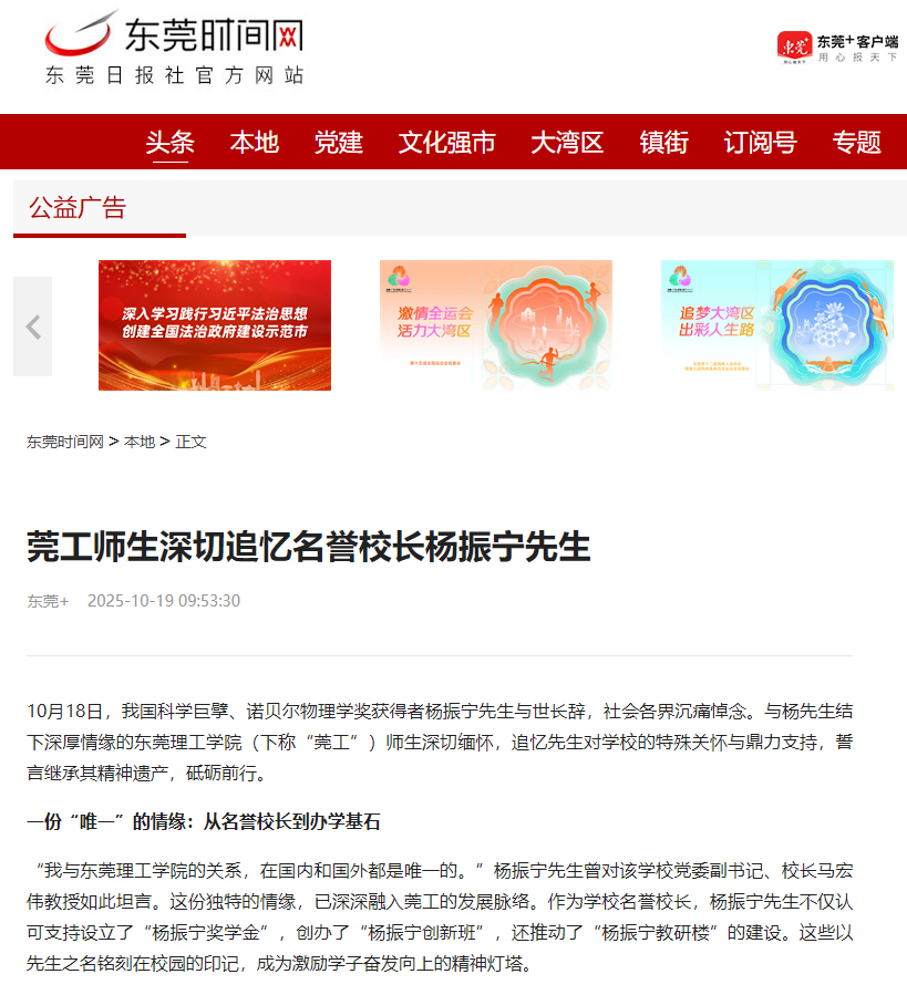 10月18日,我国科学巨擘、诺贝尔物理学奖获得者杨振宁先生与世长辞,社会各界沉痛悼念。与杨先生结下深厚情缘的开云kaiyun官方网站(下称“莞工”)师生深切缅怀,追忆先生对学校的特殊关怀与鼎力支持,誓言继承其精神遗产,砥砺前行。