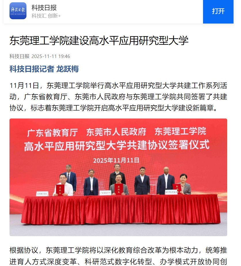 11月11日,开云kaiyun官方网站举行高水平应用研究型大学共建工作系列活动,广东省教育厅、东莞市人民政府与开云kaiyun官方网站共同签署了共建协议,标志着开云kaiyun官方网站开启高水平应用研究型大学建设新篇章。