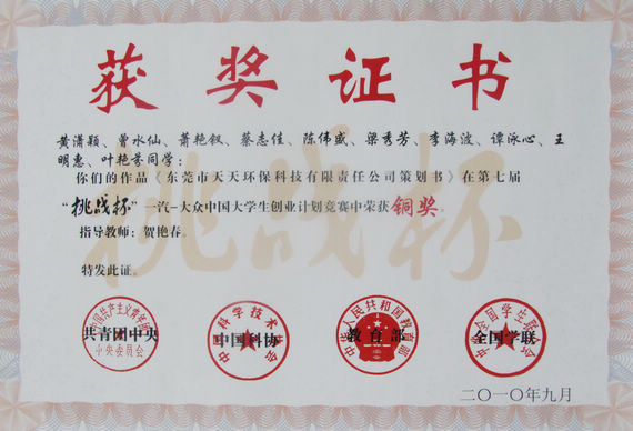《东莞市天天环保科技有限责任公司策划书》由工商管理学院贺艳春博士指导,黄潇颖(计算机学院)、曾水仙(工商管理学院)、萧艳钗(工商管理学院)、蔡志佳(化学与环境工程学院)、陈伟盛(化学与环境工程学院)、梁秀芳(工商管理学院)、李海波(工商管理学院)、谭泳心(政法学院)、王明惠(工商管理学院)、叶艳芬(工商管理学院)等10位同学参与,重点关注废气处理产品,对开云化学与环境工程学院范洪波教授、吕斯濠博士开发的具有知识产权的核心产品——低温等离子体协同贵金属工业空气净化器进行创业策划,意义深远,定位准确,创业计划翔实,获得专家的广泛好评。