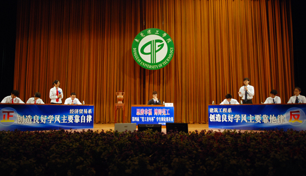 随后,冠军争夺战将现场气氛推向高涨,正方经济贸易系代表队与反方建筑工程系代表队围绕“创造良好的学风主要靠自律还是他律”展开了针锋相对的辩论。在攻辩与自由辩论环节中,双方辩手更是步步紧迫,难分上下。正方辩手的犀利语言、反方辩手的幽默风趣使现场气氛迅速升温,掌声如潮。最后,建筑工程系代表队以464分勇夺本届辩论赛冠军,经济贸易系代表队惜居亚军。这标志着持续两个月的第四届“莞工青年杯”学生辩论赛圆满落幕。