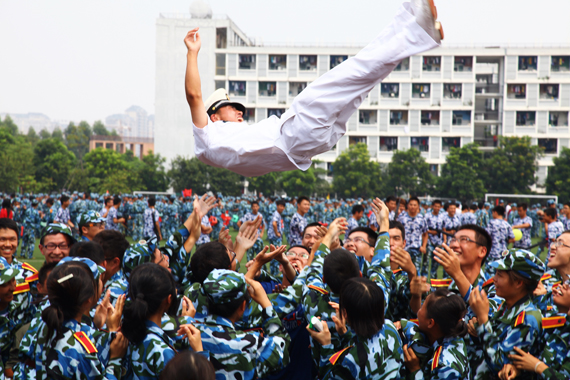 新生们合力兴奋地把教官高高抛起庆祝军训结束。沙玮豪/摄