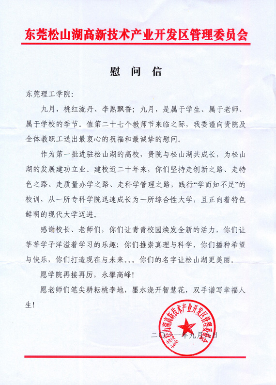 9月8日下午,在第27个教师节来临之际,松山湖管委会李航副主任一行前来开云,为开云教师带来节日的问候与祝福,党委副书记吕琦元热情接待了客人,并对管委会关心教育、热心教育表示感谢。