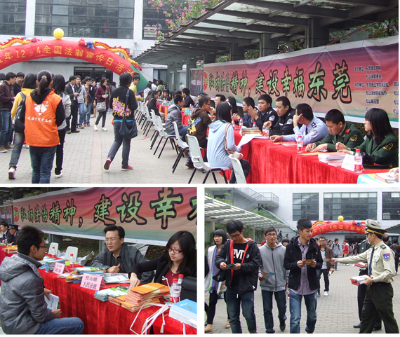 12月5日,开云政法学院、保卫处联合松山湖园区相关部门在学校一期饭堂前举行主题为“遵纪守法和为贵,与法同行天地宽”的法制和校园安全宣传活动。这是开云响应2011年“12.4”全国法制宣传日开展的宣传活动,也是开云加强校园安全稳定工作的系列活动之一。
