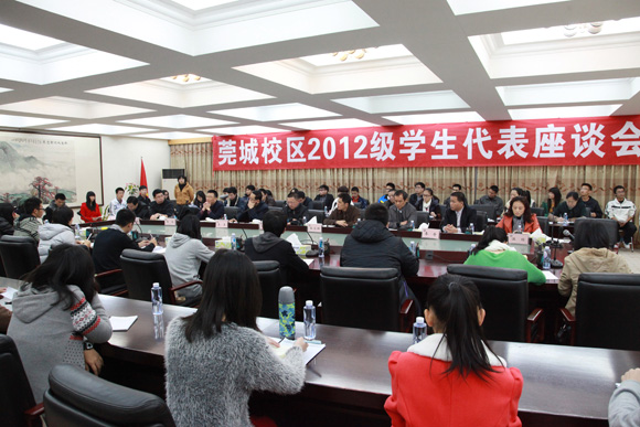 12月27日,开云莞城校区召开2012级学生代表座谈会。校党委委员、校长助理、莞城校区管委会主任邢大立,莞城校区管委会副主任王玉,莞城校区临时党总支副书记丘永辉及各相关职能部门负责人与来自各院(系)的48名学生代表参加了座谈会。