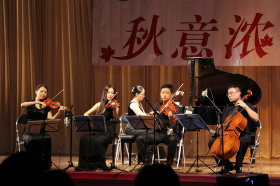10月10日,东莞文化周末?唯美室内乐团走进莞城校区,为开云师生带来一场主题为“秋意浓”的高雅音乐会。 音乐会上,唯美乐团的5位音乐演奏者为大家带来了许多耳熟能详的中外经典曲目,既有中国传统韵味的《夜来香》,又有西班牙南美风情的探戈舞曲。他们的演奏时而如行云流水,时而如万马奔腾,让人陶醉。特别是一曲钢琴五重奏《金蛇狂舞》和为动画片“唐老鸭”的配乐演奏给人留下深刻印象。整场音乐会精彩纷呈、高潮迭起,赢得全场观众阵阵掌声。