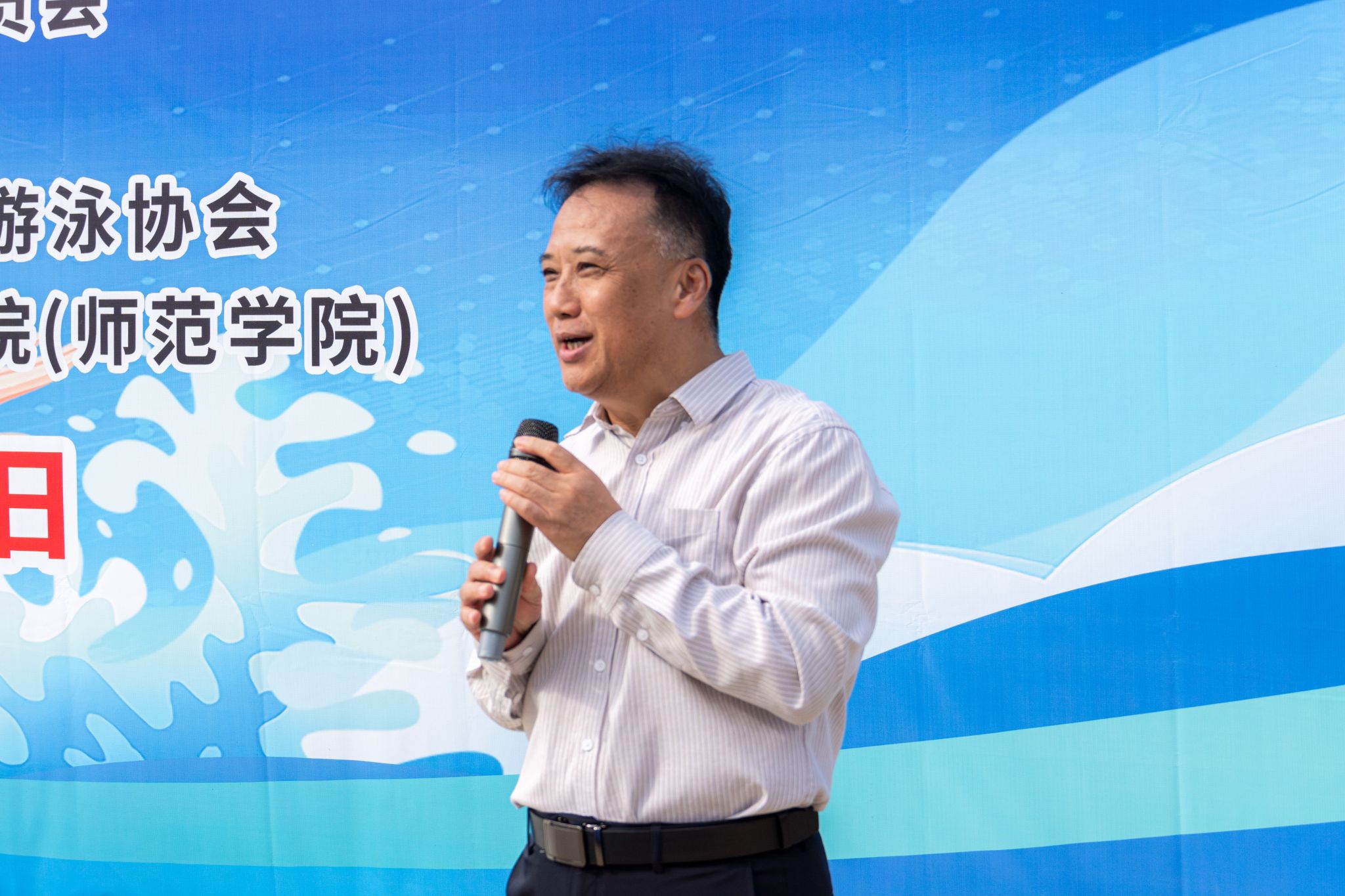下午三点,比赛准时拉开帷幕。开幕式上,学校党委副书记、校长马宏伟向参赛老师分享了自身有关游泳的小故事,鼓励参赛教职工以赛会友、以泳健身,在水中释放活力,在竞技中收获快乐,并宣布比赛正式开幕,点燃了现场所有人的热情。