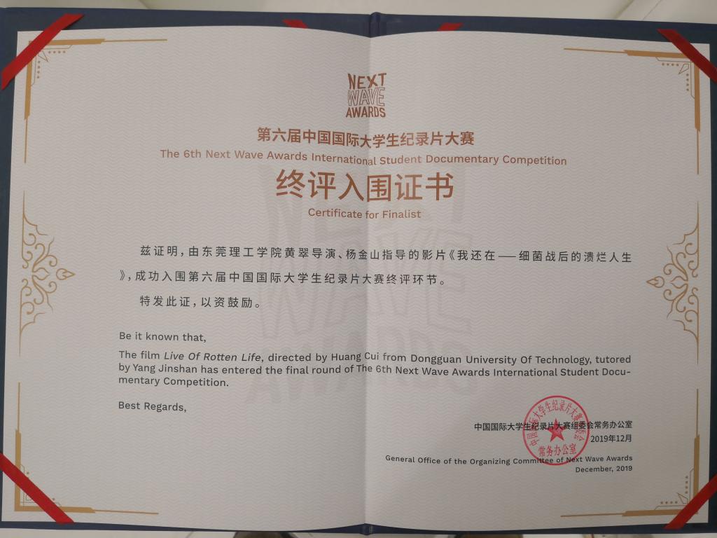 经过7位身份多元的专业评委的慎重评审与甄选,最终22部影片从801部报名影片中突围进入大赛终评名单,其中短片17部,长片5部,分别来自中国、英国、以色列、俄罗斯和罗马尼亚,我院学生黄翠、林满、张秀珠和郑钰婵等创作的《我还在——细菌战后的溃烂人生》荣列其中,获得压轴大奖“优秀纪录长片”提名。