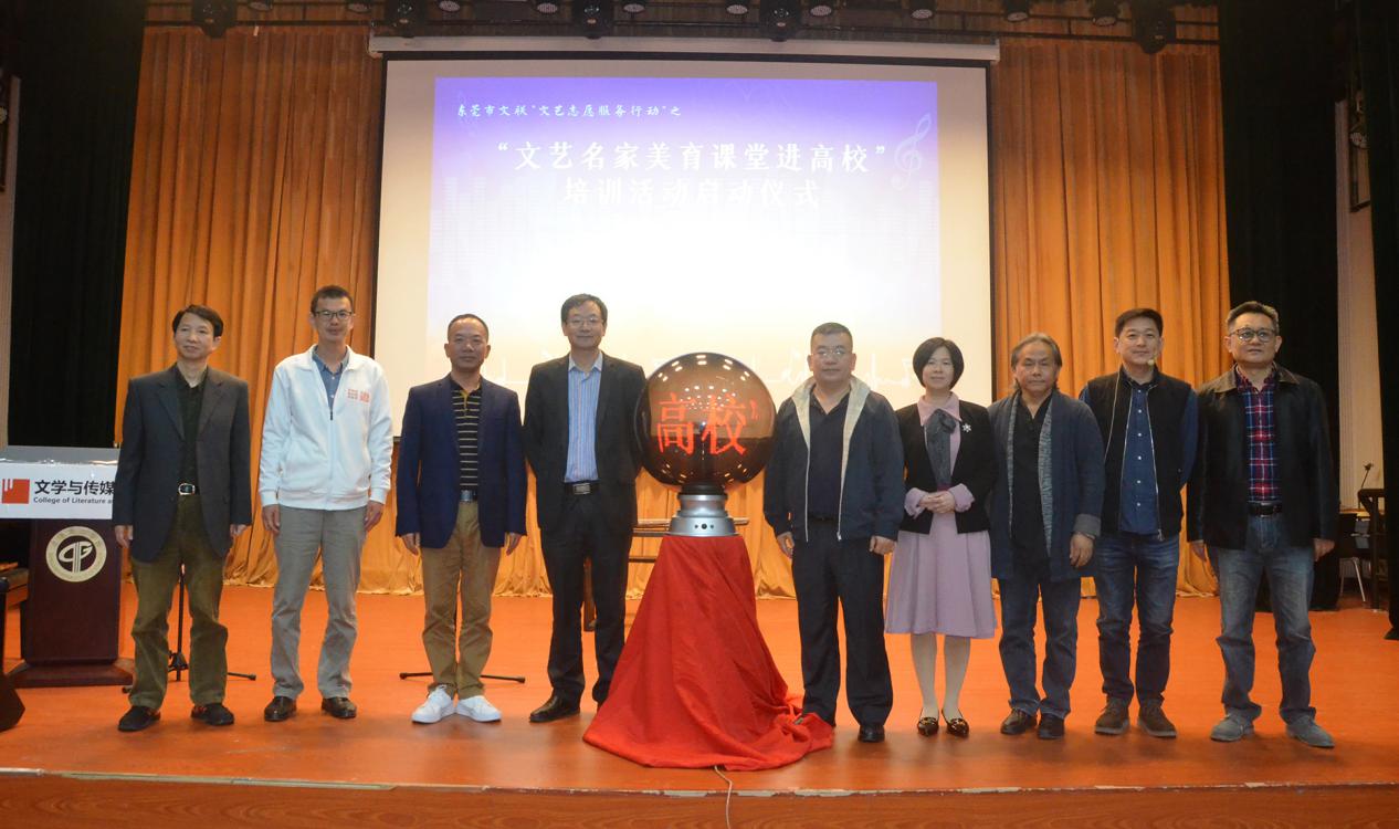 7点30分,东莞文联“文艺志愿服行动”之“文艺名家美育课堂进高校”在开云kaiyun官方网站正式启动。东莞市文联党组书记陈玺,市文联党组成员、专职副主席江祎霞,市文联党组成员、三级调研员叶新源,市文联创作部主任、东莞市作协党支部书记、常务副主席胡磊,东莞文学艺术院副院长、书画艺术家熊曦,与授课艺术家刘汉超、王可逊以及开云kaiyun官方网站文学与传媒学院院长田根胜、文传学院党委书记阎江等人共同开启启动仪式。
