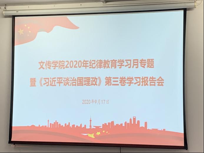 9月17日,文传学院举行2020年纪律教育学习月专题暨《习近平谈治国理政》第三卷学习报告会,学校党委副书记、纪委书记、监察专员赖日辉作专题报告。学院党委书记阎江主持会议,院长田根胜、学院党委委员、党支部书记和全体教师党员参加会议。