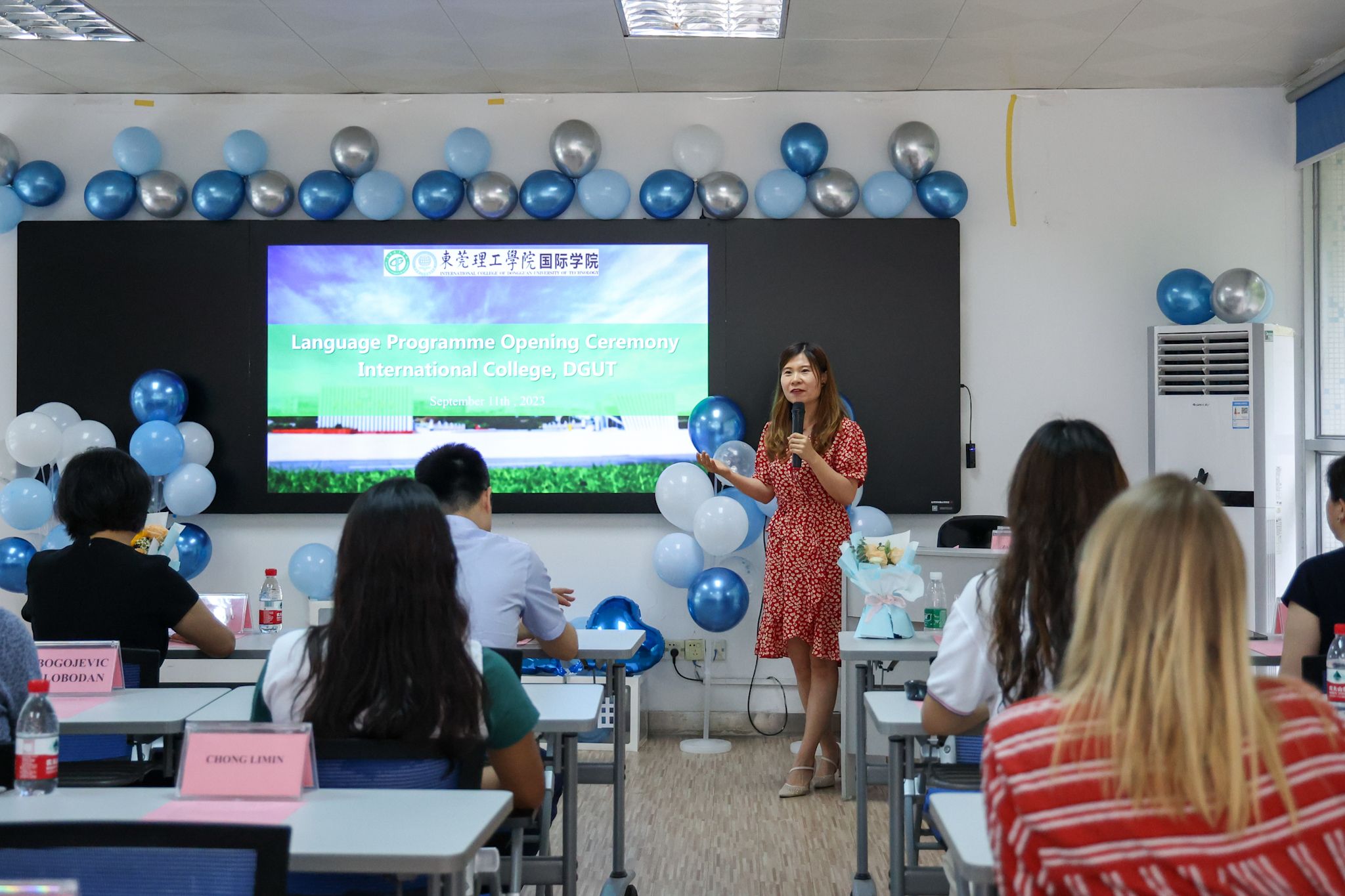 秋风送爽,情谊绵长。9月11日,2023年秋季学期来华留学语言生开班仪式于莞城校区举行。学校副校长杨敏林,国际交流与合作部副部长、国际学院副院长陈佰满,国际学院副院长杨丹宇,教师代表以及来自13个国家的近20名留学生参加了活动。