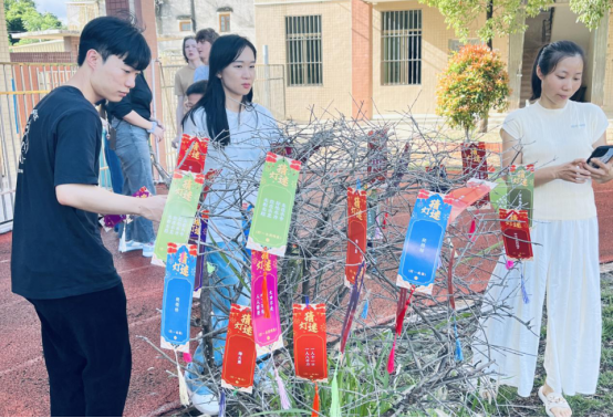 另一边,校道旁边的小树上,“爬楼梯”“烽火堡”“生在水中,却怕水冲,放在水里,无影无踪”等密密麻麻五彩斑斓的灯谜条,在微风中轻轻摇曳如灵动的文化符号。大、小朋友们三三两两驻足在灯谜前,或凝眉思索、或交头接耳。