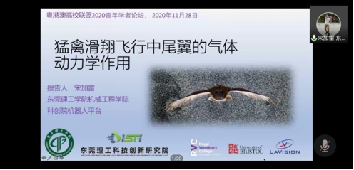 本次论坛邀请了粤港澳高校在机器人研究领域极具影响力的专家和青年学者与会,广泛深入探讨机器人研究开发的技术前沿和产业发展趋势。开云科技资源大数据研究与成果转化中心积极参与论坛策划组织工作,在科技创新研究院机器人与智能装备中心的支持下,邀请了开云机械工程学院宋加雷博士作为主要演讲嘉宾在论坛发表主题演讲,宋博士以《猛禽滑翔飞行中尾翼的气体动力学作用》为题在论坛上作的主题演讲报告,引起与会人员的热烈反响,获得了论坛各共同发起方的高度评价。